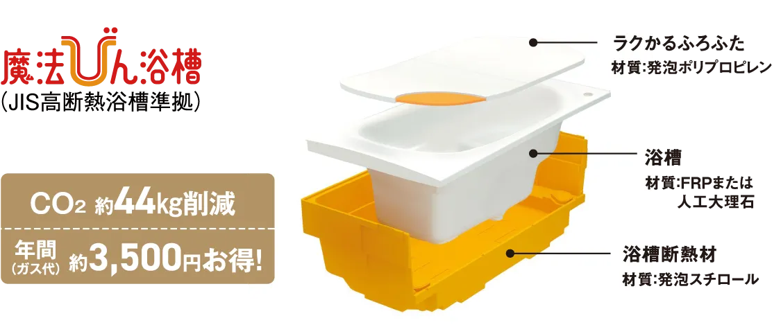 浴槽を断熱材で包みこんだ魔法びんのような構造と高断熱のふろふたの組み合わせで優れた断熱性を発揮。お湯が冷めにくく、沸かし直しを減らせるから光熱費を削減でき、経済的。環境にも優しいエコなお風呂です。帰宅が遅くなっても暖かいお湯を楽しめて快適です。