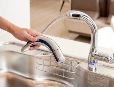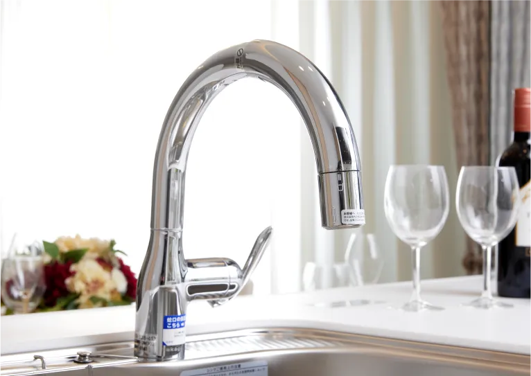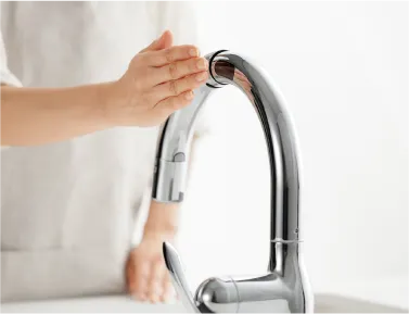 シンプルでスタイリッシュなデザインに先進の「タッチレス」機能を搭載。水栓に触れずに操作できて衛生的。側面のセンサーに手をかざすだけで0.6秒の反応速度ですばやく水を出し止めできます。ハンドシャワーや浄水機能も便利です。