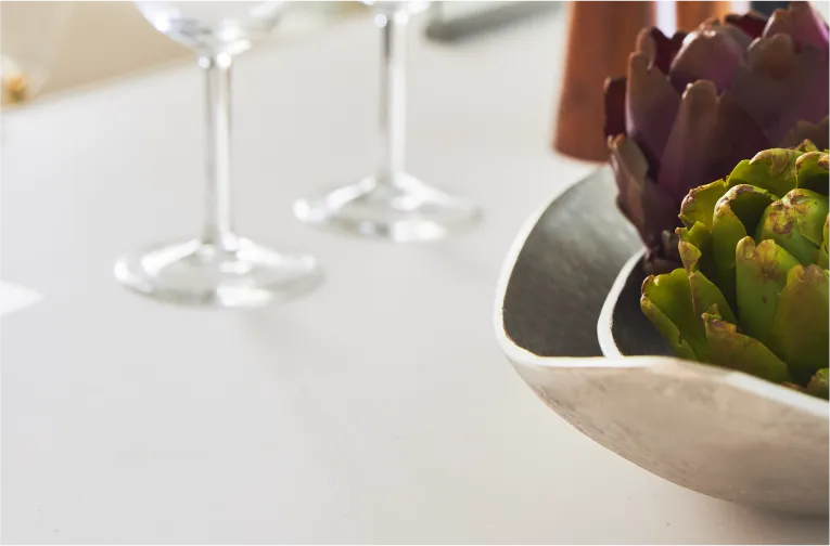キッチン天板には、一体成型で継ぎ目のない美しい表情と強い強度を両立するアクリル人造大理石「アクシーマ」を採用。お鍋などが当たっても傷つきにくく、油汚れもサッと拭くだけでキレイになるお手入れのしやすさで毎日のキッチンワークがより楽しくなります。