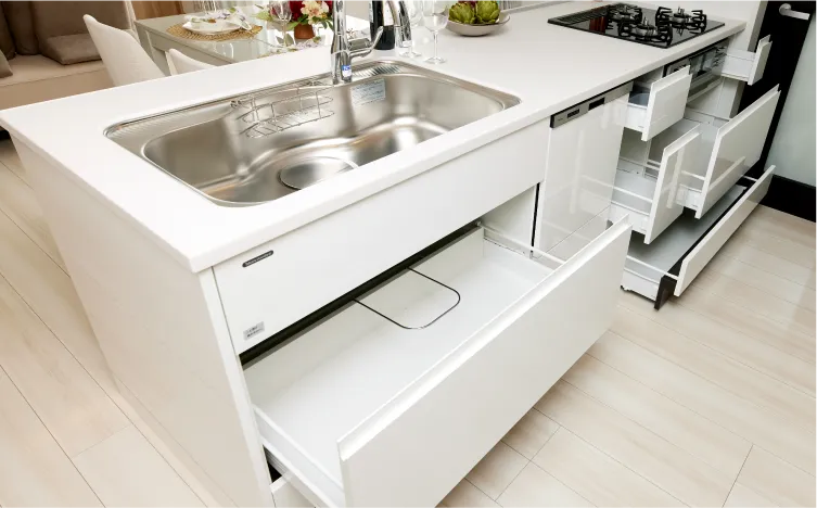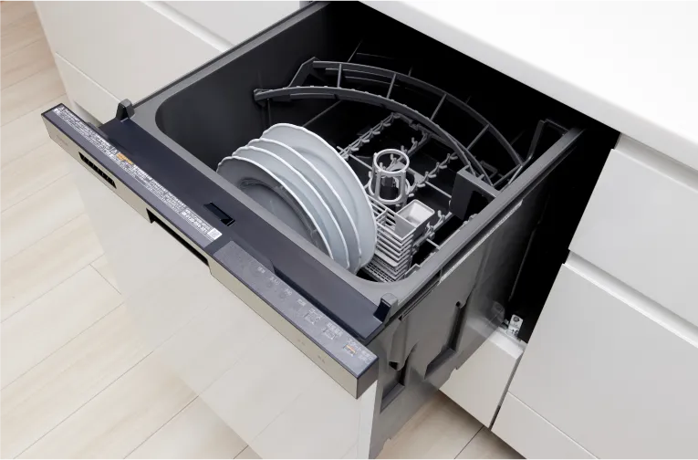 食事の後片付けの手間を軽減してくれる食器洗い乾燥機は操作ボタンを上部に設置した見やすく操作しやすい「オールトップコントロール」タイプ。食器とまな板を同時にまとめて洗浄できる大容量サイズです。排気は温度を下げた「ソフト排気」で安全にも配慮しました。