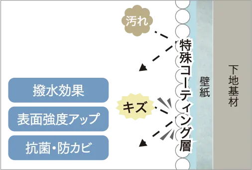 撥水コートの効果で汚れが付きにくく毎日のお手入れが簡単。抗菌・防かび効果もあり快適なお部屋環境づくりに役立ちます。※セレクト品番によります。