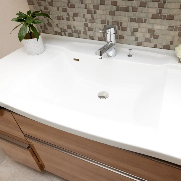 天板とボウルの継ぎ目がない一体型カウンタートップ。ゆるやかにラウンドしたボウル形状と光沢仕上げの天板が、高級感を演出します。