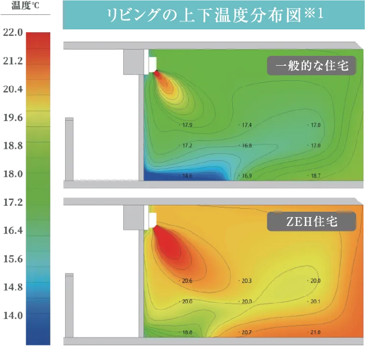 ※1 『一般的な住宅』と『ZEH住宅』についてCFD解析にて、LDの室内温度分布シミュレーションを実施:解析条件<シミュレーション共通条件>・外気温度:-0.5℃(拡張アメダス気象データ2010年版標準年より東京の最低気温)・平面プランは省エネ基準策定モデル(RC、70㎡)を参照・妻側中層階住戸を想定・エアコン設定:24℃吹出、循環風量8㎥/min・歓喜設定:24時間換気0.5回/h『一般的な住宅』・品確法「断熱等性能等級3程度の外皮性能を想定」外皮熱貫流率/外壁:1.11[W/㎡・K]窓:6.51[W/㎡・K]『ZEH住宅』・ZEH-M「Oriented程度の外皮性能を想定」※参照元:「集合住宅におけるZEHの設計ガイドライン」(集合住宅におけるZEHロードマップフォローアップ委員会)外皮熱貫流率/外壁:0.393[W/㎡・K]窓:2.15[W/㎡・K]※日射・人体発熱・家電製品の発熱は考慮しない※他室・他住戸との熱の移動は考慮しない。