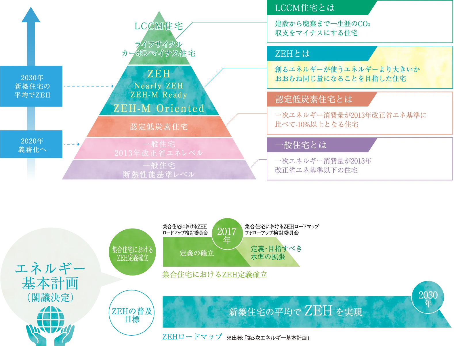 経済産業省資源エネルギー庁は、2030年までに新築住宅の平均でZEHを実現するという政策目標において